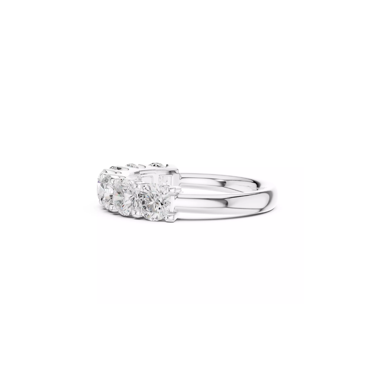 No topo do anel, sete moissanitas com lapidação redonda de 4,3 mm são cravadas individualmente em uma estrutura elevada, permitindo a máxima entrada de luz. Essa técnica realça o fogo intenso característico da moissanita, criando um efeito imponente de meia aliança, com leitura contemporânea e sofisticada.