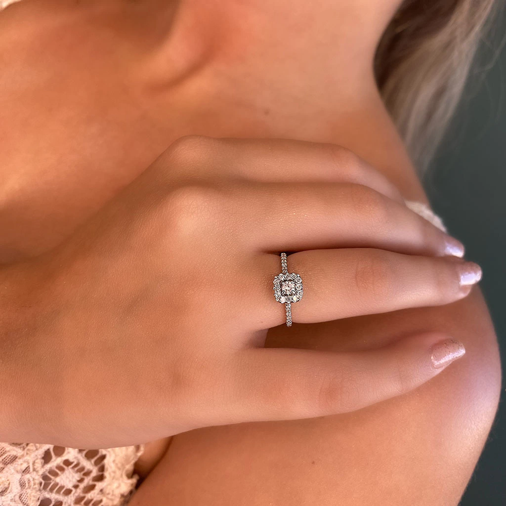 Anel com design clássico, no centro um diamante de 10 pontos e ao redor 12 diamantes de 1 ponto cada.
